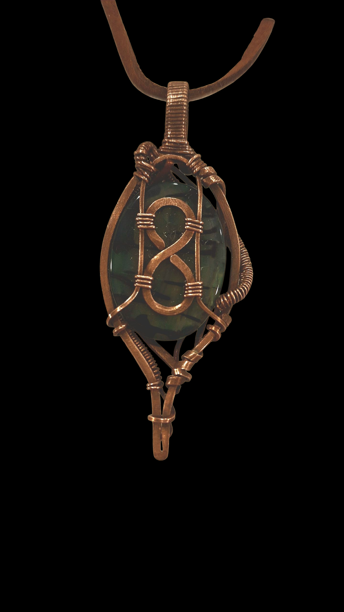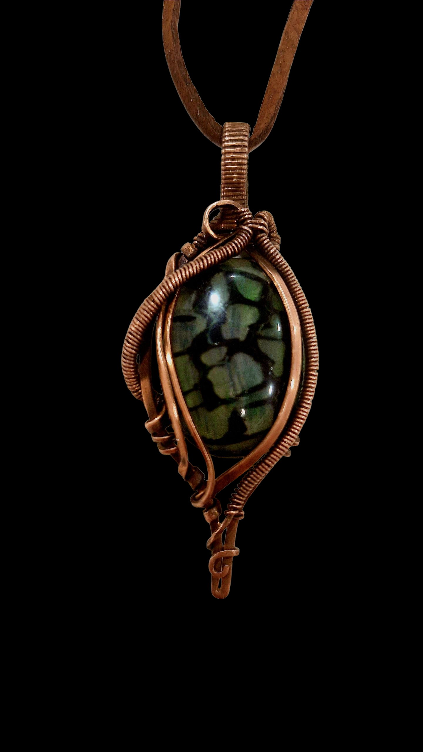 Green dragon vein agate wrapped in aged copper.