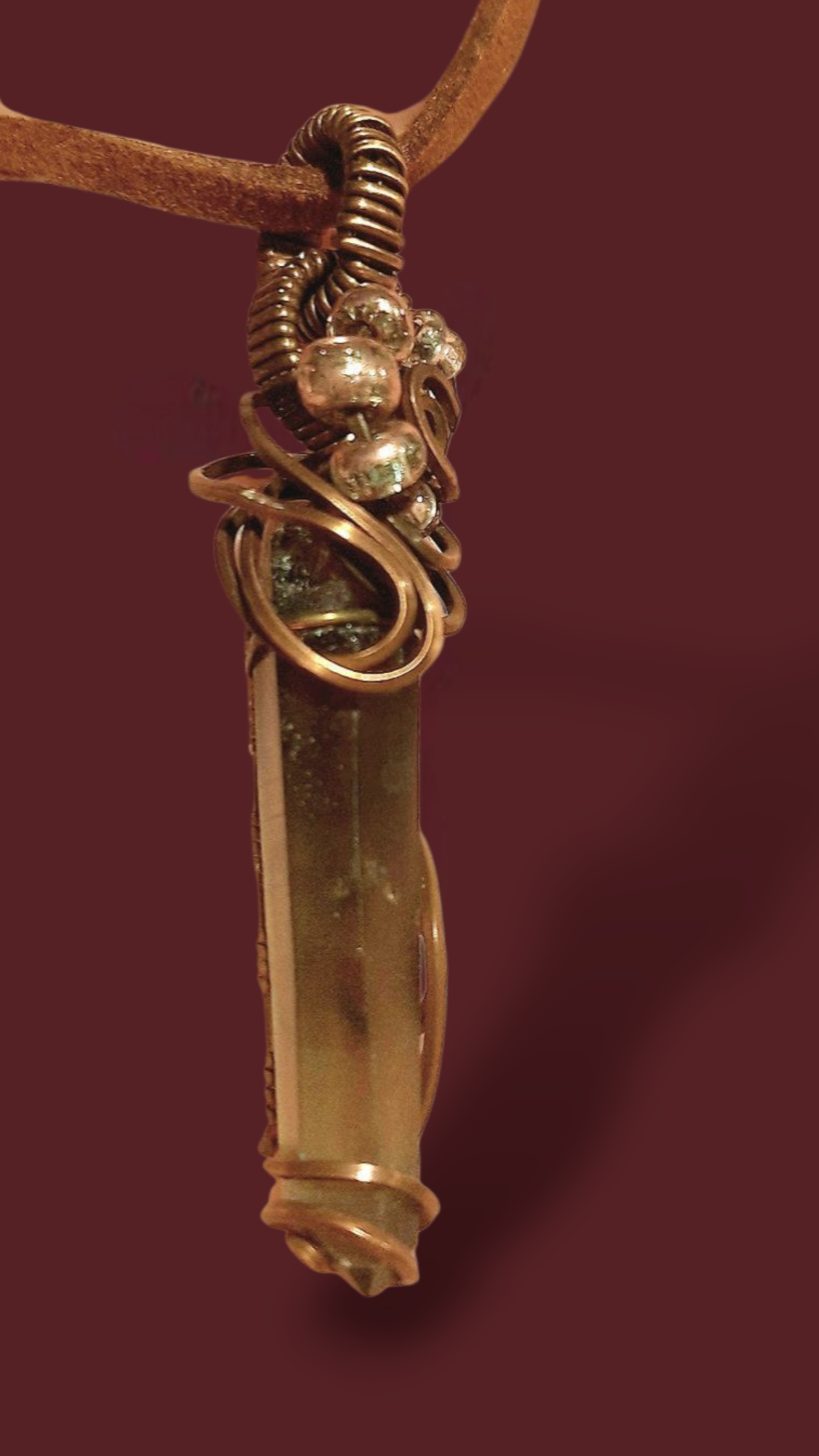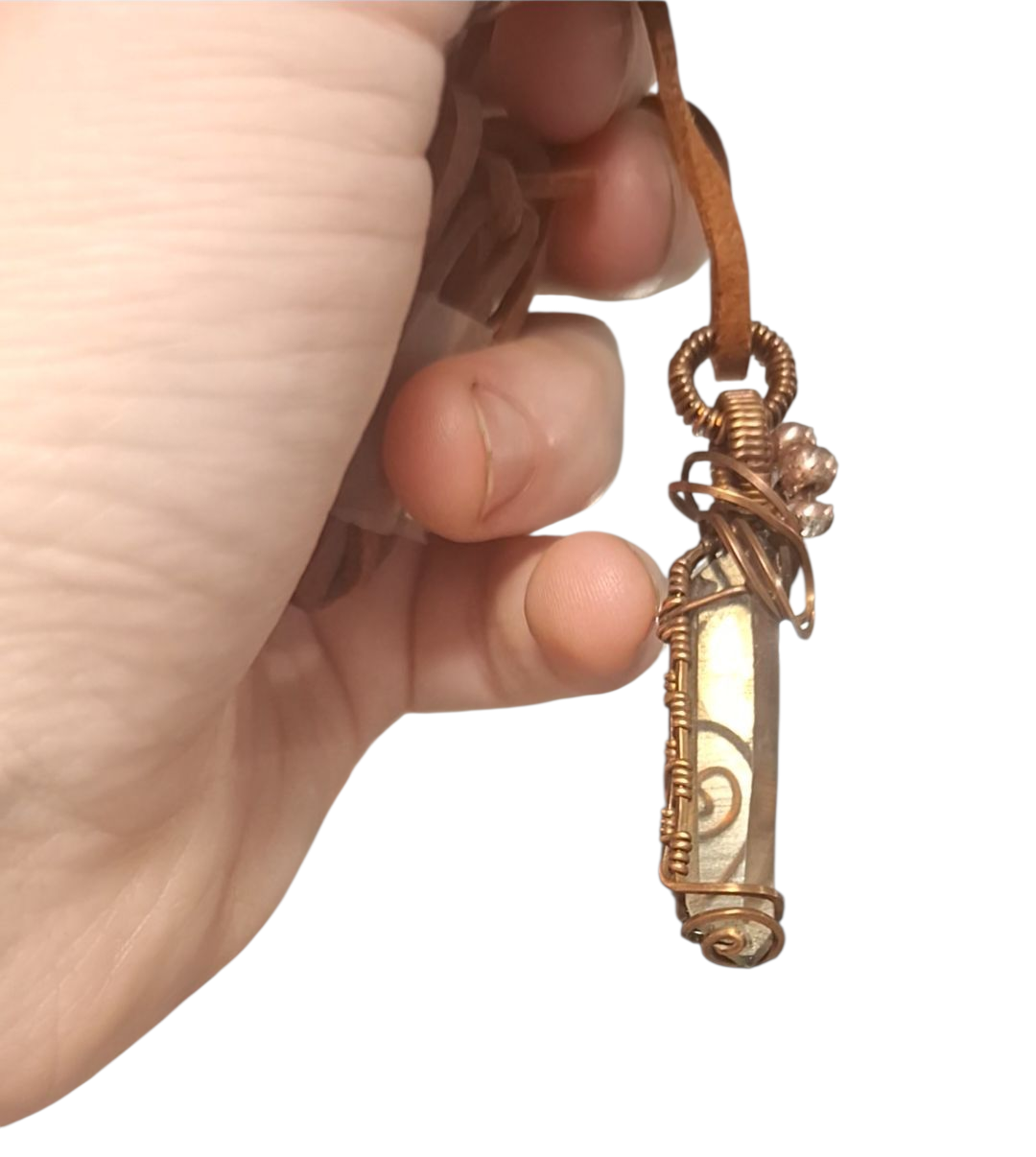 Smokey quartz point wrapped in aged copper.